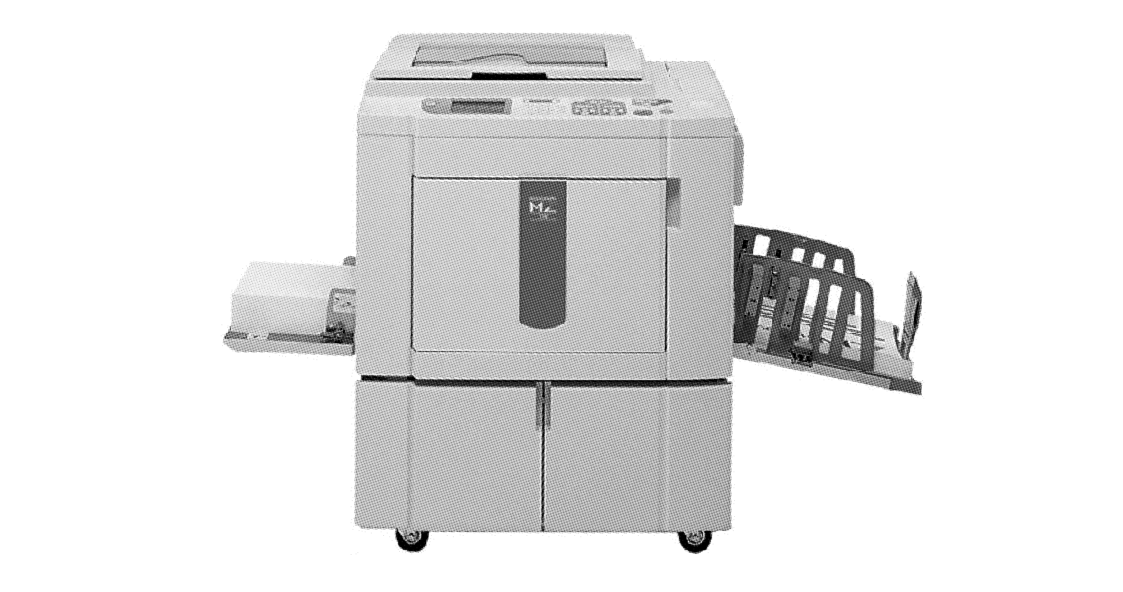 Затем матрица полностью автоматически устанавливается на печатный барабан ризографа, и за счет центрифуги смачивается чернилами из картриджа, находящегося в барабане.